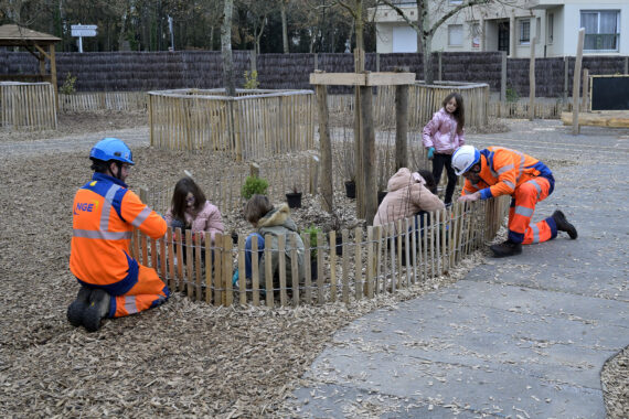Cheminements naturels, nouveau mobilier (tables, bancs, cabanes, observatoires, tables de ping-pong…), espaces dédiés à l’enseignement en plein air : les deux cours ont été transformées. Des espaces collectifs ainsi que des recoins plus tranquilles et intimistes ont été aménagés. Tout a été pensé pour permettre des usages multiples : des espaces collectifs de jeux, avec notamment des structures en rondins pour grimper, des tables pour se poser, des cabanes pour être au calme… Un verger-potager a également été créé à l’école maternelle, dans une ambiance végétale champêtre.