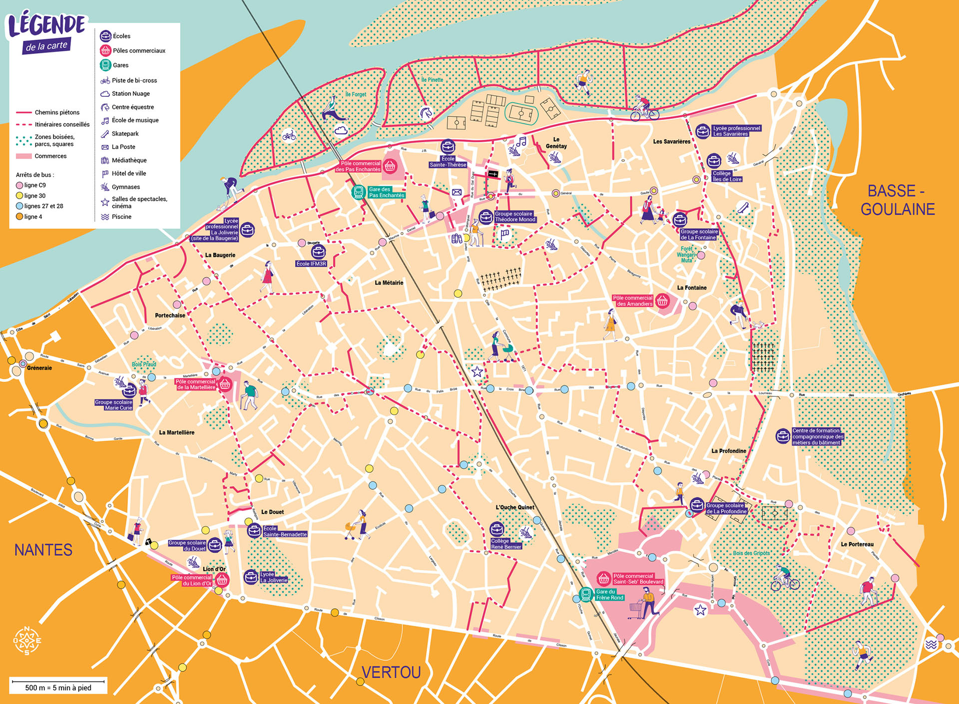 Cette carte, riche et illustrée, présente les temps de trajet en fonction du quartier de résidence. En moyenne, chaque habitant·e peut rejoindre un pôle commercial ou l’école de son quartier en 5 à 10 minutes à pied. En complément de ce document, une signalétique a été installée à l’entrée de la plupart des chemins afin de mieux les identifier.