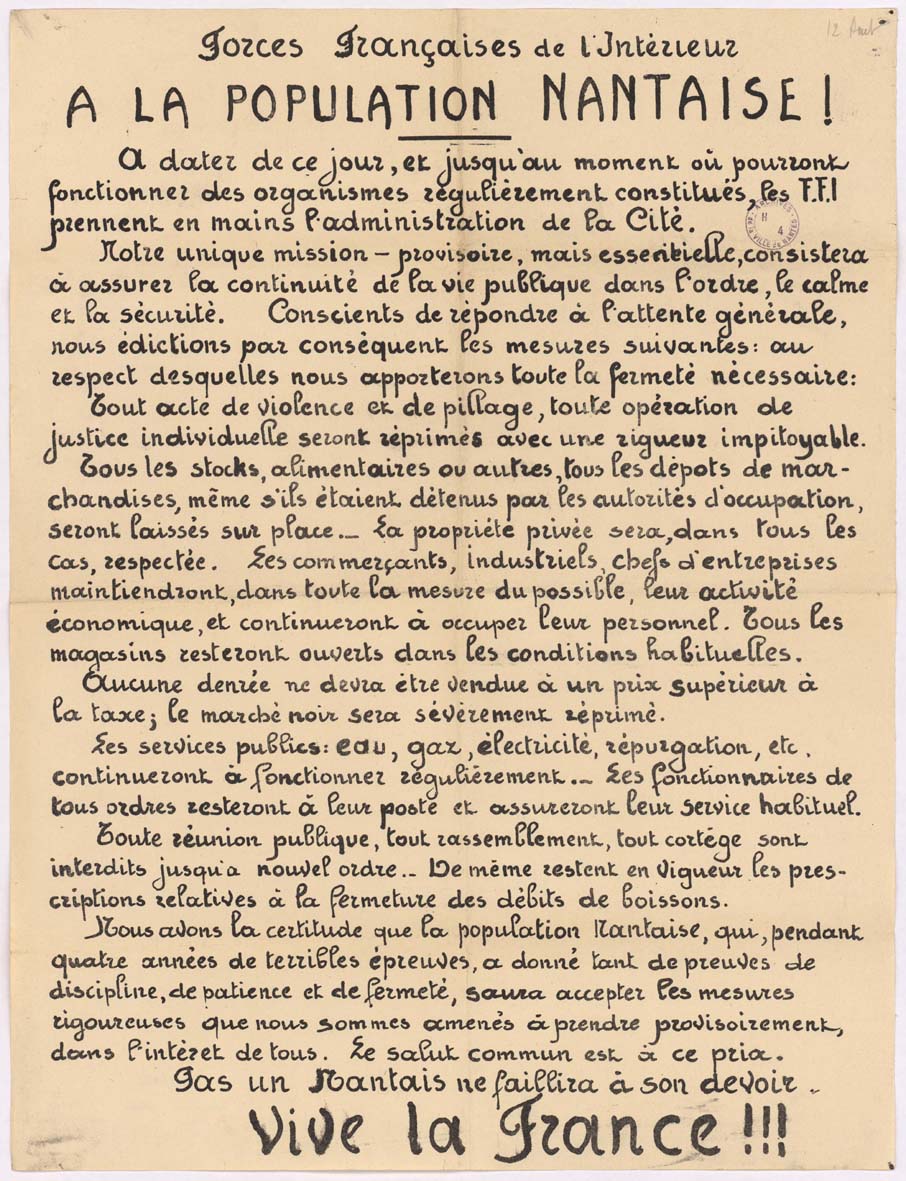 Des derniers mois de l’occupation allemande en 1944 aux premiers projets de reconstruction en 1947, cette exposition propose de découvrir le contexte de la Libération et des premières années du retour de la République à Nantes et dans les communes de la métropole. Cette exposition a été réalisée avec le concours des communes et des associations d’histoire locale.