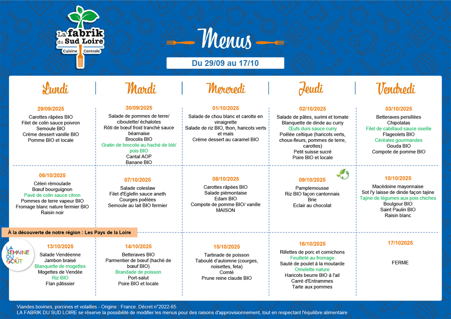 Menus de septembre et octobre 2025
